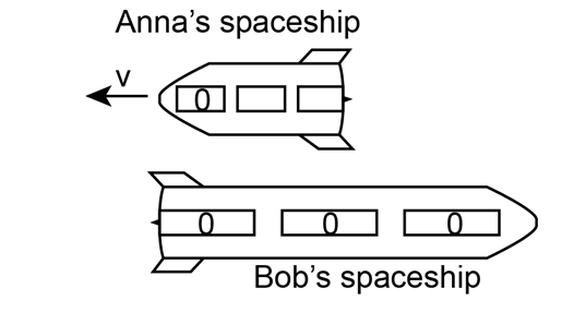 The diagram shows Bob's view of the passing of two identical spaceship. Anna's and his own, where . The length of either spaceship in its rest frame is . What are the readings on Anna', two unlabelled clocks?