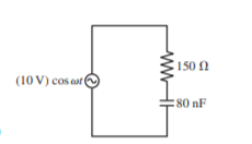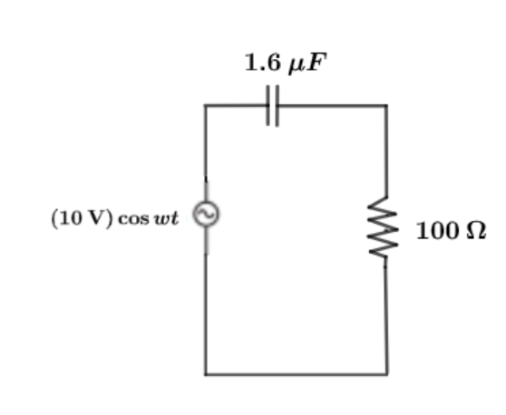A low-pass filter consists of a capacitor in series with a resistor. The circuit is driven by an source with a peak voltage of .