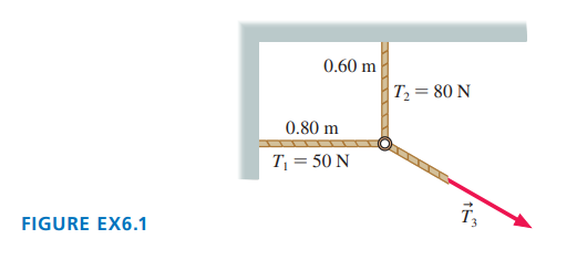 The three ropes in are tied to a small, very light ring. Two of these ropes are anchored to walls at right angles with the tensions shown in the figure. What are the magnitude and direction of the tension in the third rope?