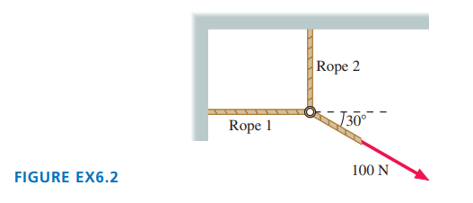 The three ropes inare tied to a small, very light ring. Two of the ropes are anchored to walls at right angles, and the third rope pulls as shown. What are and , the magnitudes of the tension forces in the first two ropes?