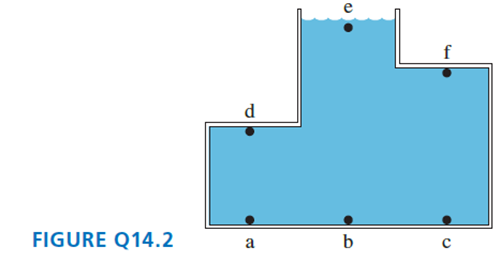 Rank in order, from largest to smallest, the pressures at a, b, and c in FIGURE Q14.2. Explain.