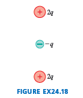 FIGURE EX24.17shows three charges. Draw these charges on your paper four times. Then draw two-dimensional cross sections of three-dimensional closed surfaces through which the electric flux is (a) 2q/ϵ0, (b) q/ϵ0, (c) 0,and (d) 5q/ϵ0.