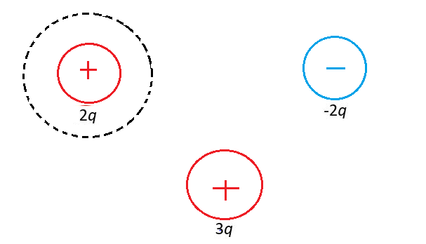 FIGUREEX24.18shows three charges. Draw these charges on your paper four times. Then draw two-dimensional cross sections of three-dimensional closed surfaces through which the electric flux is (a) -q/ϵ0, (b) q/ϵ0, (c) 3q/ϵ0, and (d) 4q/ϵ0.