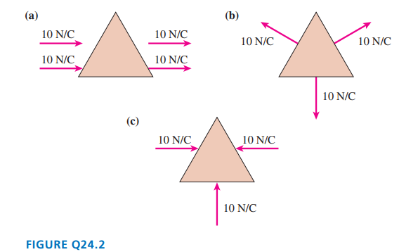 FIGURE Q24.2 shows cross sections of three-dimensional closed surfaces. They have a flat top and bottom surface above and below the plane of the page. However, the electric field is everywhere parallel to the page, so there is no flux through the top or bottom surface. The electric field is uniform over each face of the surface. For each, does the surface enclose a net positive charge, a net negative charge, or no net charge? Explain.