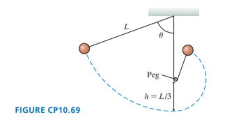 A pendulum is formed from a small ball of mass m on a string of length L. AsFIGURE shows, a peg is height above the pendulum鈥檚 lowest point. From what minimum angle u must the pendulum be released in order for the ball to go over the top of the peg without the string going slack?