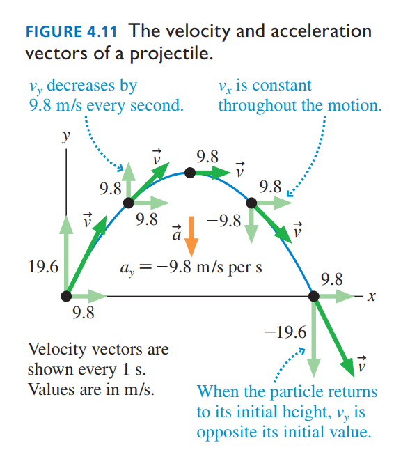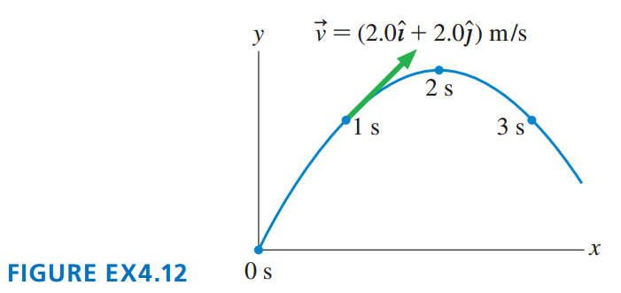 12. A physics student on Planet Exidor throws a ball, and it follows the parabolic trajectory shown in FIGURE EX4.12. The ball's position is shown at 1s intervals until. At , the ball's velocity is localid="1647396327258" .