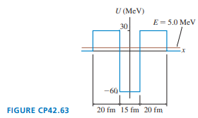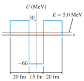 Alpha decay occurs when an alpha particle tunnels through the Coulomb barrier. FIGURE CP42.63 shows a simple one-dimensional model of the potential-energy well of an alpha particle in a nucleus with A ≈ 235. The 15 fm width of this one-dimensional potential-energy well is the diameter of the nucleus. Further, to keep the model simple, the Coulomb barrier has been modeled as a 20-fm-wide, 30-MeV-high rectangular potential-energy barrier. The goal of this problem is to calculate the half-life of an alpha particle in the energy level E = 5.0 MeV. a. What is the kinetic energy of the alpha particle while inside the nucleus? What is its kinetic energy after it escapes from the nucleus? b. Consider the alpha particle within the nucleus to be a point particle bouncing back and forth with the kinetic energy you found in part a. What is the particle’s collision rate, the number of times per second it collides with a wall of the potential? c. What is the tunneling probability Ptunnel ? d. Ptunnel is the probability that on any one collision with a wall the alpha particle tunnels through instead of reflecting. The probability of not tunneling is 1 - Ptunnel. Hence the probability that the alpha particle is still inside the nucleus after N collisions is 11 - Ptunnel 2N ≈ 1 - NPtunnel , where we’ve used the binomial approximation because Ptunnel V 1. The half-life is the time at which half the nuclei have not yet decayed. Use this to determine (in years) the half-life of the nucleus.