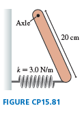 shows a uniform rod pivoted at one end. The other end is attached to a horizontal spring. The spring is neither stretched nor compressed when the rod hangs straight down. What is the rod’s oscillation period? You can assume that the rod’s angle from vertical is always small.
