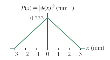 3 shows the probability density for an electron that has passed through an experimental apparatus. What is the probability that the electron will land in a 0.010-mm-wide strip at (a) x = 0.000 mm, (b) x = 0.500 mm, (c) x = 1.000 mm, and (d) x = 2.000 mm?