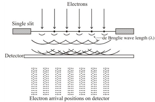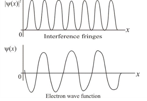 Explanation with diagram of electron arrival positions om detector, Interference fringes and electron wave function.