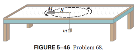 A flat puck (mass M) is revolved in a circle on a frictionless air hockey table top, and is held in this orbit by a massless cord which is connected to a dangling mass (mass m) through a central hole as shown in Fig. 5鈥46. Show that the speed of the puck is given by \(v = \sqrt {\frac{{mgR}}{M}} \).
