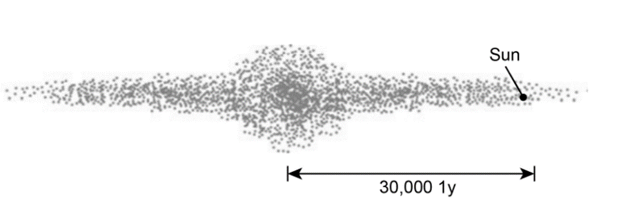 The Sun revolves around the centre of the Milky Way Galaxy (Fig- 5-49) at a distance of about 30,000 light-years from the centre (\({\bf{1}}\;{\bf{ly}} = {\bf{9}}{\bf{.5}} \times {\bf{1}}{{\bf{0}}^{{\bf{15}}}}\;{\bf{m}}\)). If it takes about 200 million years to make one revolution, estimate the mass of our Galaxy. Assume that the mass distribution of our Galaxy is concentrated mostly in a central uniform sphere. If all the stars had about the mass of our Sun (\({\bf{2}} \times {\bf{1}}{{\bf{0}}^{{\bf{30}}}}\;{\bf{kg}}\)), how many stars would there be in our Galaxy?