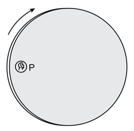 A penny is placed on a turntable which is spinning clockwise as shown in Fig. 5–37. If the power to the turntable is turned off, which arrow best represents the direction of the acceleration of the penny at point P while the turntable is still spinning but slowing down?