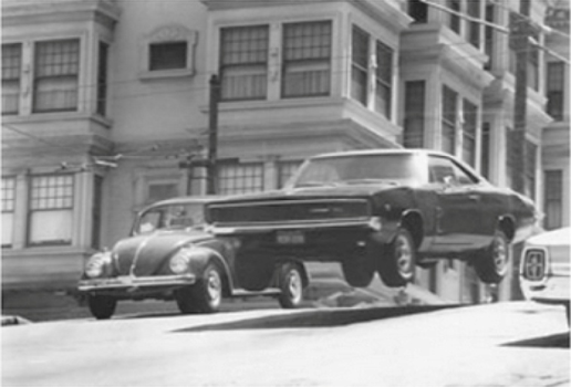 The design of a new road includes a straight stretch that is horizontal and flat but that suddenly dips down a steep hill at 18°. The transition should be rounded with what minimum radius so that cars traveling 95 km/h will not leave the road (Fig. 5–40)?