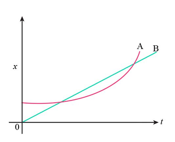 Figure 2-50 shows the position vs. time graph for two bicycles, A and B. (a) Identify any instant at which the two bicycles have the same velocity. (b) Which bicycle has the larger acceleration? (c) At which instant(s) are the bicycles passing each other? Which bicycle is passing the other? (d) Which bicycle has the largest instantaneous velocity? (e) Which bicycle has the larger average velocity?