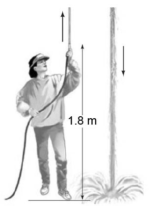 Suppose you adjust your garden hose nozzle for a fast stream of water. You point the nozzle vertically upward at the height of 1.8 m above the ground (Fig. 2–40). When you quickly turn off the nozzle, you hear the water striking the ground next to you for another 2.5 s. What is the water speed as it leaves the nozzle?