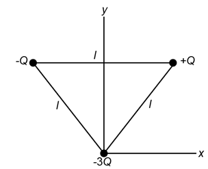 Question: Three charges are at the corners of an equilateral triangle (side l) as shown in Fig. 17–45. Determine the potential at the midpoint of each of the sides. Let \[{\bf{V = 0}}\] at \[{\bf{r = }}\infty \].