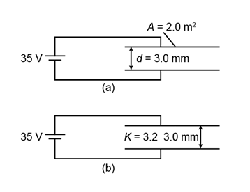 A parallel-plate capacitor with plate area\({\bf{A = 2}}{\bf{.0}}\;{{\bf{m}}{\bf{2}}}\)and plate separation\({\bf{d = 3}}{\bf{.0}}\;{\bf{mm}}\)is connected to a 35-V battery (Fig. 17–51a).