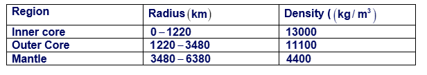 (III) The Earth is not a uniform sphere, but has regions of varying density. Consider a simple model of the Earth divided into three regions—inner core, outer core, and mantle. Each region is taken to have a unique constant density (the average density of that region in the real Earth):
