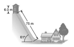 (II) A house at the bottom of a hill is fed by a full tank of water 6.0 m deep and connected to the house by a pipe that is 75 m long at an angle of 61掳 from the horizontal (Fig. 10鈥49). (a) Determine the water gauge pressure at the house. (b) How high could the water shoot if it came vertically out of a broken pipe in front of the house?