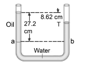 Water and then oil (which don鈥檛 mix) are poured into a U-shaped tube, open at both ends. They come to equilibrium as shown in Fig. 10鈥50. What is the density of the oil? [Hint: Pressures at points a and b are equal. Why?]