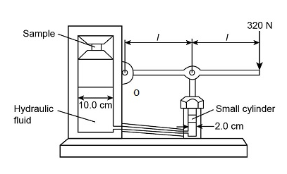 (II) A hydraulic press for compacting powdered samples has a large cylinder that is 10.0cm in diameter, and a small cylinder with a diameter of 2.0 cm (Fig. 10鈥51). A lever is attached to the small cylinder as shown. The sample, which is placed on the large cylinder, has an area of 4.0 cm2. What is the pressure on the sample if 320N is applied to the lever?