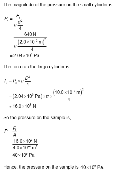 (II) A hydraulic press for compacting powdered samples has a large cylinder that is 10.0cm in diameter, and a small cylinder with a diameter of 2.0 cm (Fig. 10鈥51). A lever is attached to the small cylinder as shown. The sample, which is placed on the large cylinder, has an area of 4.0 cm2. What is the pressure on the sample if 320N is applied to the lever?