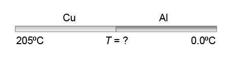 : (III) A copper rod and an aluminum rod of the same length and cross-sectional area are attached end to end (Fig. 14–18). The copper end is placed in a furnace maintained at a constant temperature of 205°C. The aluminum end is placed in an ice bath held at a constant temperature of 0.0°C. Calculate the temperature at the point where the two rods are joined.