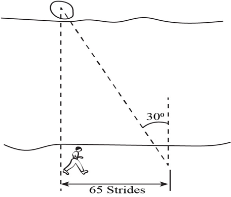 Jim stands beside a river and wonders how wide it is. He spots a large rock on the bank directly across from him. He then walks 65 strides upstream and judges that the angle between him and the rock, which he can still see, is atdownstream (See below figure). Jim measures his stride to be about 0.8 m long. Estimate the width of the river.