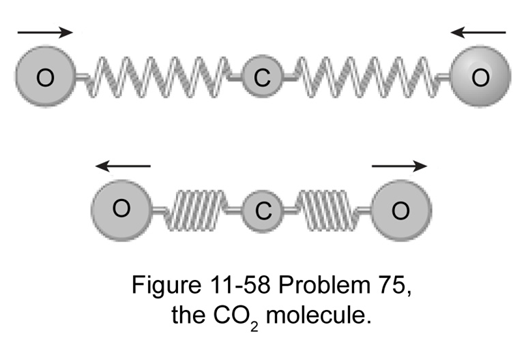 Carbon dioxide is a linear molecule. The carbon鈥搊xygen bonds in this molecule act very much like springs. Figure 11鈥58 shows one possible way the oxygen atoms in this molecule can oscillate: the oxygen atoms oscillate symmetrically in and out, while the central carbon atom remains at rest. Hence each oxygen atom acts like a simple harmonic oscillator with a mass equal to the mass of an oxygen atom. It is observed that this oscillation occurs at a frequency \(f{\bf{ = 2}}{\bf{.83 \times 1}}{{\bf{0}}^{{\bf{13}}}}\;{\bf{Hz}}\). What is the spring constant of the C-O bond?