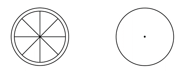 Two wheels having the same radius and mass rotate at the same angular velocity (Fig. 8–38). One wheel is made with spokes so nearly all the mass is at the rim. The other is a solid disk. How do their rotational kinetic energies compare?