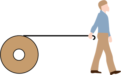 A large spool of rope rolls on the ground with the end of the rope lying on the top edge of the spool. A person grabs the end of the rope and walks a distance l, holding onto it, Fig. 8鈥64. The spool rolls behind the person without slipping. What length of rope unwinds from the spool? How far does the spool鈥檚 center of mass move?