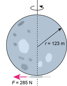 A spherical asteroid with radius\(r = 123\;{\rm{m}}\)and mass\(M = 2.25 \times {10^{10}}\;{\rm{kg}}\)rotates about an axis at four revolutions per day. A 鈥渢ug鈥 spaceship attaches itself to the asteroid鈥檚 south pole (as defined by the axis of rotation) and fires its engine, applying a force F tangentially to the asteroid鈥檚 surface as shown in Fig. 8鈥65. If\(F = 285\;{\rm{N}}\)how long will it take the tug to rotate the asteroid鈥檚 axis of rotation through an angle of 5.0掳 by this method?
