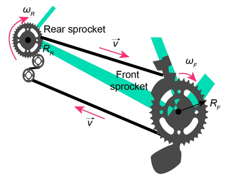 (a.) The angular velocity of the rear wheel of the bicycle is related to the angular velocity of the front sprocket as \(\frac{{{\omega _{\rm{R}}}}}{{{\omega _{\rm{F}}}}} = \frac{{{N_{\rm{F}}}}}{{{N_{\rm{R}}}}}\).