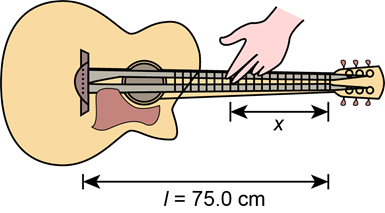 Question: (III) When a player’s finger presses a guitar string down onto a fret, the length of the vibrating portion of the string is shortened, thereby increasing the string’s fundamental frequency (see Fig. 12–36). The string’s tension and mass per unit length remain unchanged. If the unfingered length of the string is l= 75.0 cm, determine the positions x of the first six frets, if each fret raises the pitch of the fundamental by one musical note compared to the neighboring fret. On the equally tempered chromatic scale, the ratio of frequencies of neighboring notes is 21/12.