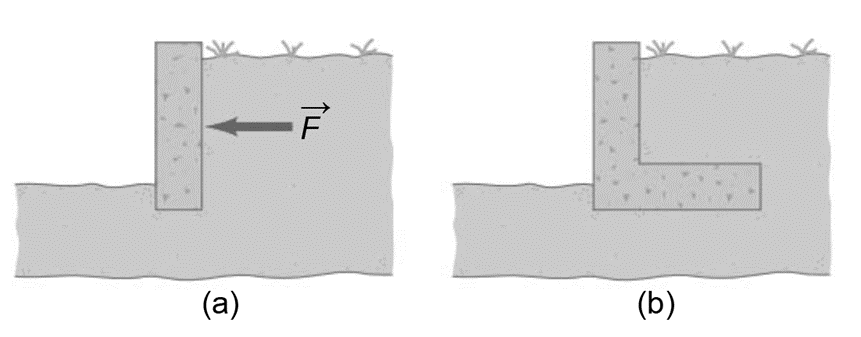 A ground retaining wall is shown in Fig. 9–36a. The ground, particularly when wet, can exert a significant force F on the wall. (a) What force produces the torque to keep the wall upright? (b) Explain why the retaining wall in Fig. 9–36b would be much less likely to overturn than that in Fig. 9–36a.