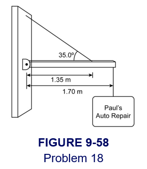 A shop sign weighing 215 N hangs from the end of a uniform 155-N beam, as shown in Fig. 9鈥58. Find the tension in the supporting wire (at 35.0掳) and the horizontal and vertical forces exerted by the hinge on the beam at the wall. [Hint: First, draw a free-body diagram