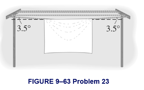 (II) A 0.75-kg sheet is centered on a clothesline as shown in Fig. 9鈥63. The clothesline on either side of the hanging sheet makes an angle of 3.5掳 with the horizontal. Calculate the tension in the clothesline (ignore its mass) on either side of the sheet. Why is the tension so much greater than the weight of the sheet?
