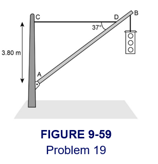 A traffic light hangs from a pole, as shown in Fig. 9鈥59. The uniform aluminum pole AB is 7.20 m long and has a mass of 12.0 kg. The mass of the traffic light is 21.5 kg. Determine (a) the tension in the horizontal massless cable CD and (b) the vertical and horizontal components of the force exerted by pivot A on the aluminum pole.