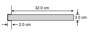 When a wood shelf of mass 6.6 kg is fastened inside a slot in a vertical support as shown in Fig. 9–92, the support exerts a torque on the shelf. (a) Draw a free-body diagram for the shelf, assuming three vertical forces (two exerted by the support slot—explain why). Then calculate (b) the magnitudes of the three forces and (c) the torque exerted by the support (about the left end of the shelf).