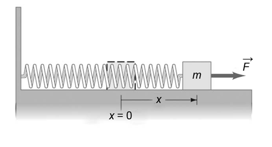 A mass m is attached to a spring which is held stretched a distance x by a force F, Fig. 6鈥45, and then released. The spring pulls the mass to the left, towards its natural equilibrium length. Assuming there is no friction, determine the speed of the mass m when the spring returns: (a) to its normal length (x = 0); (b) to half its original extension \(\left( {{x \mathord{\left/{\vphantom {x 2}} \right.} 2}} \right)\).
