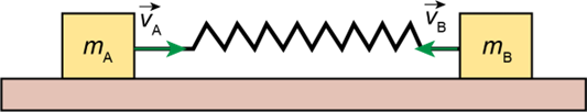 Two blocks of mass\({m_{\rm{A}}}\)and\({m_{\rm{B}}}\), resting on a frictionless table, are connected by a stretched spring and then released (Fig. 7–48). (a) Is there a net external force on the system before release? (b) Determine the ratio of their speeds,\({v_{\rm{A}}}/{v_{\rm{B}}}\)(c) What is the ratio of their kinetic energies? (d) Describe the motion of the CM of this system. Ignore mass of spring.