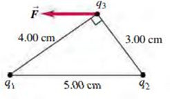 Three charges are placed as shown in Fig. P21.95. The magnitude of q1 is 2.00 mC, but its sign and the value of the charge q2 are not known. Charge q3 is +4.00 mC, and the net force F on q3 is entirely in the negative x-direction. (a) Considering the different possible signs of q1, there are four possible force diagrams representing the forces F 1 and F2 that q1 and q2 exert on q3. Sketch these four possible force configurations. (b) Using the sketches from part (a) and the direction of F , deduce the signs of the charges q1 and q2. (c) Calculate the magnitude of q2. (d) Determine F, the magnitude of the net force on q3