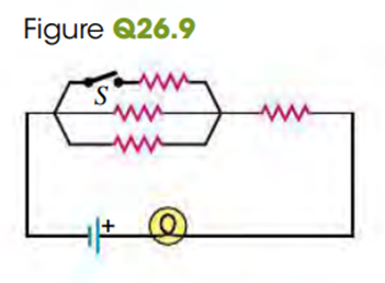 A light bulb is connected in the circuit shown in Fig. Q 26.9. If we close the switch S, does the bulb brightness increase, decrease or remain the same? Explain why.