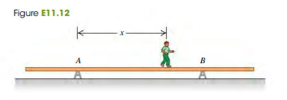 A uniform aluminium beam 9.00 m long, weighing 300 N, rests symmetrically on two supports 5.00 m apart (Fig. E11.12). A boy weighing 600 N starts at point A and walks toward the right.