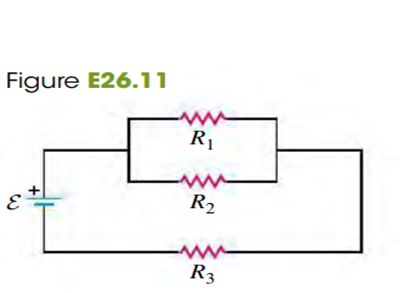 In Fig. E26.11, the battery has emf 35.0 V and negligible internal resistance. . The current through is , 1.5 A and the current through is 4.50 A. What are the resistances and ?