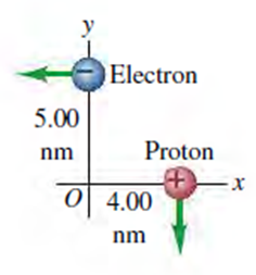 An electron and a proton are each moving at 735 km>s in perpendicular paths as shown in Fig.. At the instant when they are at the positions shown, find the magnitude and direction of