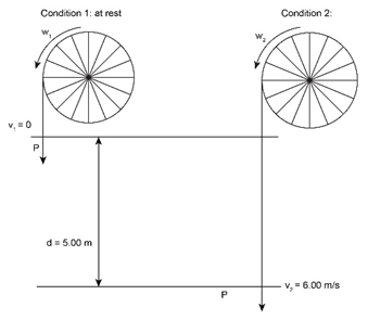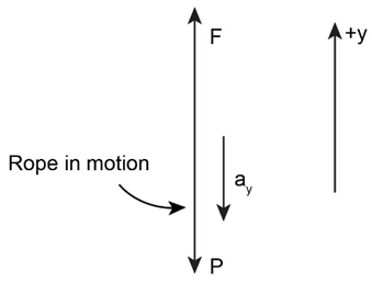 A light, flexible rope is wrapped several times around a hollow cylinder, with a weight of 40.0 N and a radius of 0.25 m, that rotates without friction about a fixed horizontal axis. The cylinder is attached to the axle by spokes of a negligible moment of inertia. The cylinder is initially at rest. The free end of the rope is pulled with a constant force P for a distance of 5.00 m, at which point the end of the rope is moving at 6.00 m>s. If the rope does not slip on the cylinder, what is P?