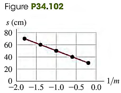 In setting up an experiment for a high school biology lab, you use a concave spherical mirror to produce real images of a 4.00 - mm -tall firefly. The firefly is to the right of the mirror, on the mirror鈥檚 optic axis, and serves as a real object for the mirror. You want to determine how far the object must be from the mirror鈥檚 vertex (that is, object distance ) to produce an image of a specified height. First, you place a square of white cardboard to the right of the object and find what its distance from the vertex needs to be so that the image is sharply focused on it. Next you measure the height of the sharply focused images for five values of . For each value, you then calculate the lateral magnification . You find that if you graph your data with on the vertical axis and on the horizontal axis, then your measured points fall close to a straight line. (a) Explain why the data plotted this way should fall close to a straight line. (b) Use the graph in Fig. P34.102 to calculate the focal length of the mirror. (c) How far from the mirror鈥檚 vertex should you place the object in order for the image to be real 8.00 mm, tall, and inverted? (d) According to Fig. P34.102, starting from the position that you calculated in part (c), should you move the object closer to the mirror or farther from it to increase the height of the inverted, real image? What distance should you move the object in order to increase the image height from to 12.00 mm? (e) Explain why approaches zero as approaches . Can you produce a sharp image on the cardboard when s = 25 cm ? (f) Explain why you can鈥檛 see sharp images on the cardboard when s < 25 cm (and is positive).