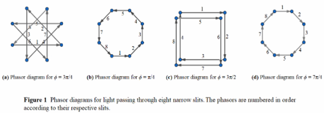 An interference pattern is produced by eight equally spaced narrow slits. The caption for Fig. 36.14 claims that minima occur for f =, , and/4. Draw the phasor diagram for each of these four cases, and explain why each diagram proves that there is in fact a minimum. In each case, for which pairs of slits are there totally destructive interference?